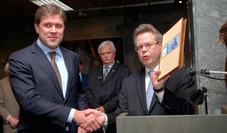 נגיד הבנק המרכזי באיסלנד ושר האוצר בטקס השקת שטר של 10000 קורנות השווה 85$ הקרונה האיסלנדית איבדה בתוך 50 שנה 99.9% מערכה ביחס לזהב |