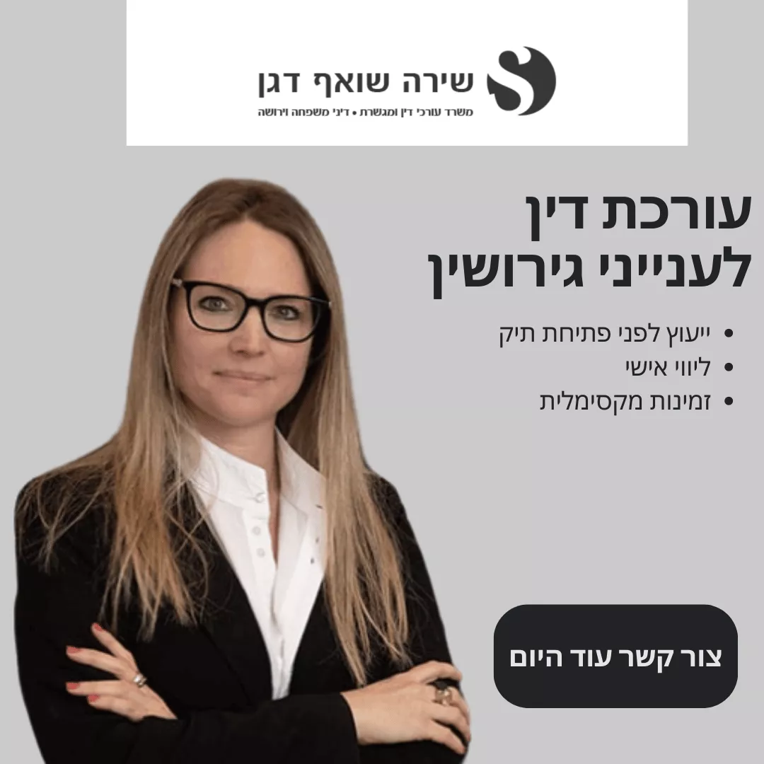 למידע נוסף ולתיאום פגישת ייעוץ, פנו למשרד עורכי דין שירה שואף דגן – מומחים בדיני משפחה וגירושין עם ניסיון רב שנים בליווי מקצועי ואישי של לקוחות במהלך אחד הפרקים המאתגרים ביותר בחיים.